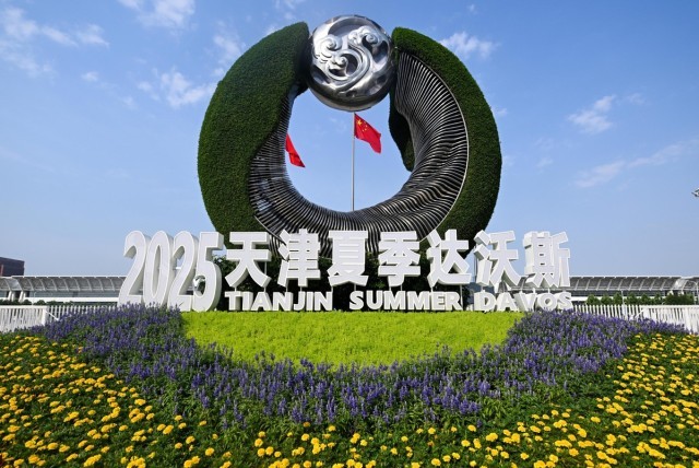 6月25日在国家会展中心(天津)外拍摄的2025年夏季达沃斯论坛主题花坛。(图片来源:新华社)