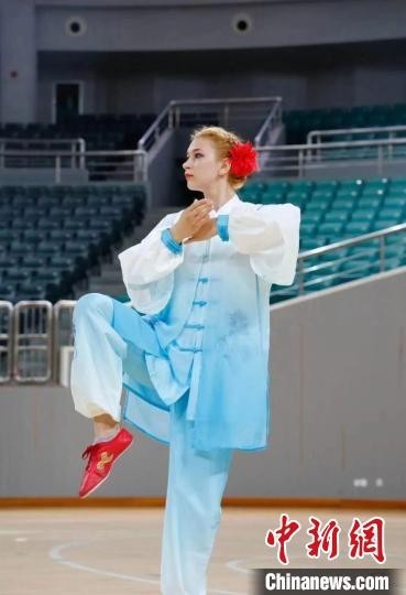 莎何娜斯身穿中国传统服饰进行武术表演。湖州师范学院供图