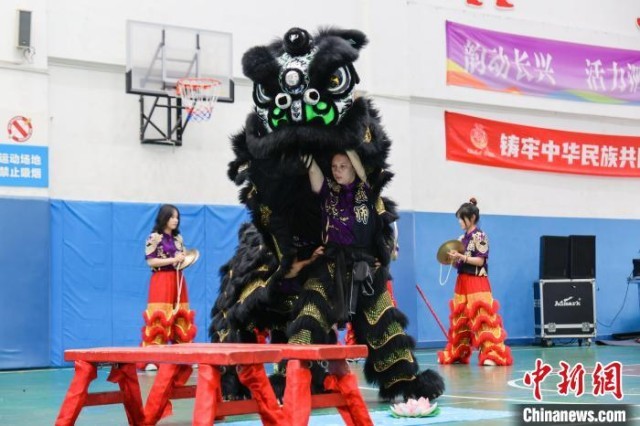 莎何娜斯(中间)表演舞狮。湖州师范学院供图
