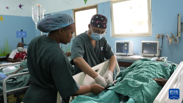 4月11日,在莫桑比克马普托,中国援莫医疗队医生凌勇(右)和当地医护人员对病人进行术后护理。新华社记者 刘杰 摄