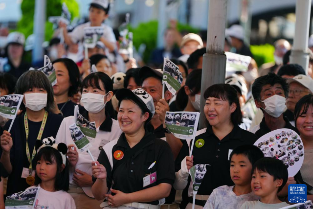 6月28日,工作人员与当地民众在日本和歌山县冒险世界游乐园送别四只大熊猫。新华社记者 贾浩成 摄