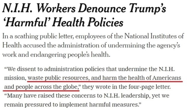近日,NIH近百名现任和新近被解职的职员发表联名信,批评美国现政府“有害”的卫生政策危害美国和全球人民的健康,将科学研究政治化并浪费公共资源。