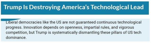 文章称,研究机构、人才、资金等一直是支撑美国创新发展的重要支柱,而美国现政府正在系统性地拆除这些支柱,断送自己的科技领先地位。