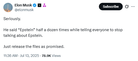 马斯克则当地时间13日在社交媒体平台X上“喊话”特朗普:“他说了六次‘爱泼斯坦’,同时告诉大家不要再谈论爱泼斯坦。按承诺公布文件吧。”