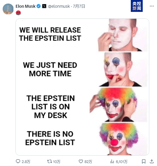而此前一天,在美国联邦调查局及司法部公布结论后,马斯克也曾在X上发布一张小丑形象的梗图,回应美司法部对爱泼斯坦案的表态。