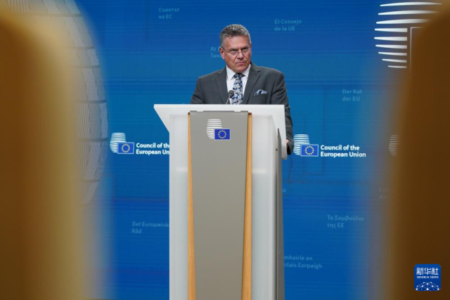 7月14日,在比利时布鲁塞尔,欧盟委员会负责贸易和经济安全等事务的委员谢夫乔维奇出席新闻发布会。新华社记者 彭子洋 摄