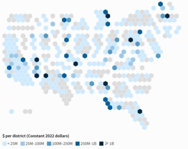 从上图中可以看出,有些美国国会议员的选区,单是获得的军工项目就超过十亿美元。