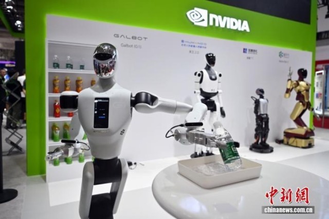第三届链博会数字科技链展区的英伟达展台,人形机器人正在演示运送水瓶。