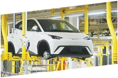 巴西巴伊亚州卡马萨里市的比亚迪工厂,一辆新能源汽车正在组装中。
