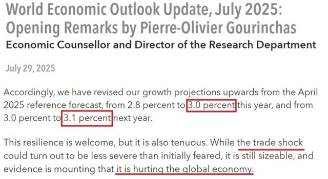 在谈及上调增长预期的原因时,IMF报告称,这是由于今年以来,全球基于对美国加征关税的预期,经济活动提前“加速”,以及当前美国的实际关税税率低于4月发出的威胁。但即便如此,最新数据仍低于年初预测的3.3%的世界经济增长率。