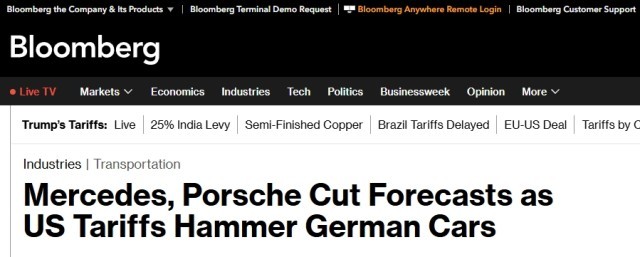 欧洲豪华车阵营同样遭受重创。彭博社报道显示,受美国新关税政策及全球需求影响,梅赛德斯-奔驰与保时捷双双下调年度利润预期。梅赛德斯预计汽车业务利润率将从至少6%降至4%以下,其高端化战略正被贸易壁垒削弱;保时捷则因无美国生产基地,在关税叠加品牌战略调整成本(约13亿欧元)的双重压力下,销售回报率可能滑落至5%(原目标6.5%)。