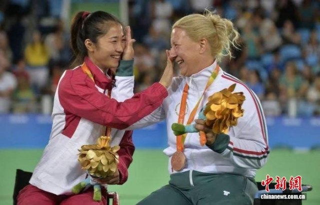2016年9月14日,里约残奥会,轮椅击剑女子个人花剑A级比赛冠军获得者中国选手荣静正与获得铜牌的匈牙利选手克拉伊尼亚克相互擦拭喜悦的泪水。 萨乐马什 摄