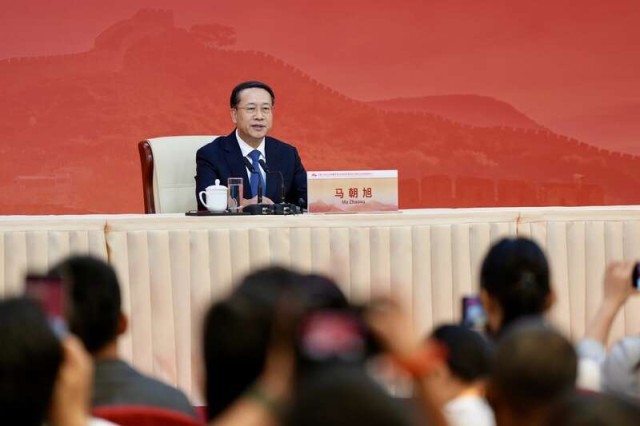 8月29日上午,中国人民抗日战争暨世界反法西斯战争胜利80周年纪念活动新闻中心在梅地亚新闻中心二层新闻发布厅举办第二场记者招待会,外交部副部长马朝旭介绍坚持和平发展、推动构建人类命运共同体有关情况,并回答记者提问。中青报·中青网记者 李隽辉/摄