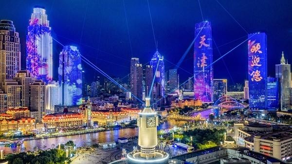 8月25日,天津点亮海河沿线夜景灯光喜迎2025年上海合作组织峰会,喜迎“上合时刻”。视觉中国供图