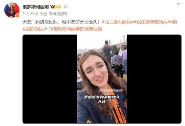 十年后,阿丽娜终于圆梦,来到了北京。九三阅兵当天,阿丽娜在社交媒体上接连发布多条帖文,并用中文表达了自己的开心,“中国军人太帅了”“俄中友谊天长地久”!