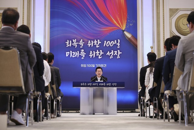 【环球时报驻韩国特约记者 黎枳银 环球时报记者 丁雅栀 环球时报特约记者 韩雯】11日上午,韩国总统李在明在青瓦台举行就职百日记者会。据韩国纽西斯通讯社介绍,这场原计划90分钟的记者会最终持续了150分钟。李在明共回答了22个问题,比就职30天记者会时多了7个问题。“恢复与正常化的时间”,这是李在明在开场发言中对过去100天的简单概括。除了经济、韩朝关系等“传统话题”,美国拘留300多名韩国公民成为11日记者会上主要焦点之一。李在明直言,此事导致韩企在对美投资时“非常犹豫”。接受《环球时报》记者采访的专家表示,现任韩国政府提出的“务实外交”正面临多重挑战。对于李在明上任百天的执政表现,韩媒作出各种评价:纽斯频通讯社称,在民生与经济恢复方面,李在明倾注全力,获得超出预期的评价;《中央日报》认为,李在明需要拿出更多民众感受得到的成果;《国民日报》则说,“接下来才是真正的考验”。