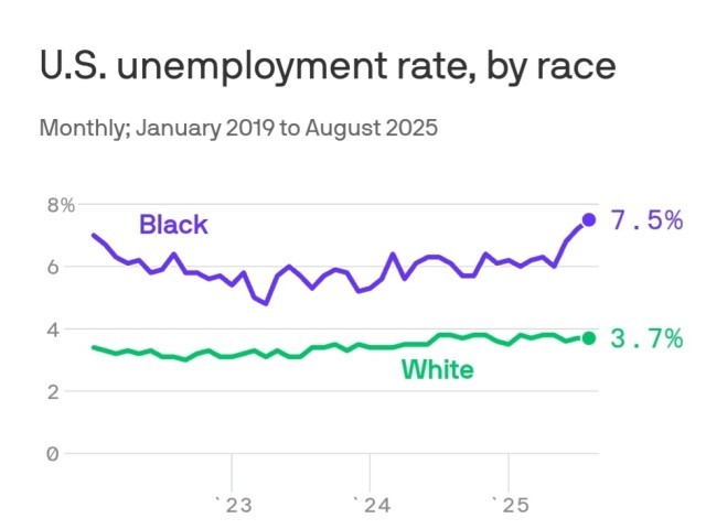 △阿克西奥斯新闻网根据美国劳工统计局数据制作的2019年1月至2025年8月非洲裔美国人与美国白人的失业率对比曲线图
