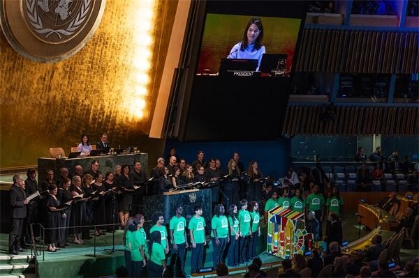 9月22日,美国纽约联合国总部,合唱团进行表演,纪念联合国成立80周年。视觉中国供图