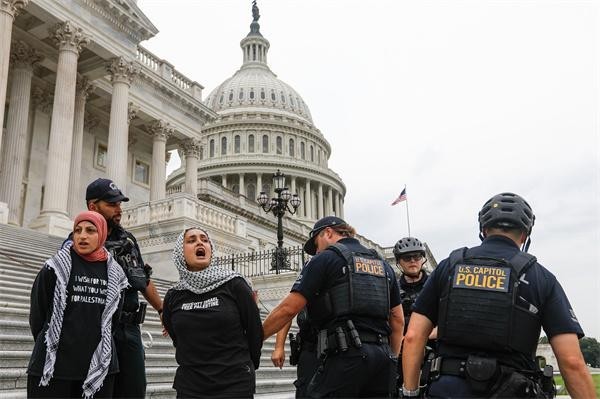 9月24日,美国华盛顿特区,美国警察在美国国会大厦前拘捕支持巴勒斯坦的示威者。视觉中国供图