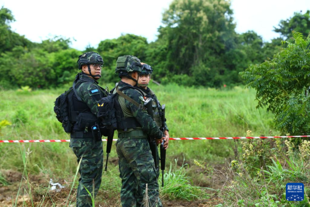 10月10日,在泰国沙缴府,泰军士兵在泰柬边境区域进行排雷作业。新华社记者 孙玮彤 摄