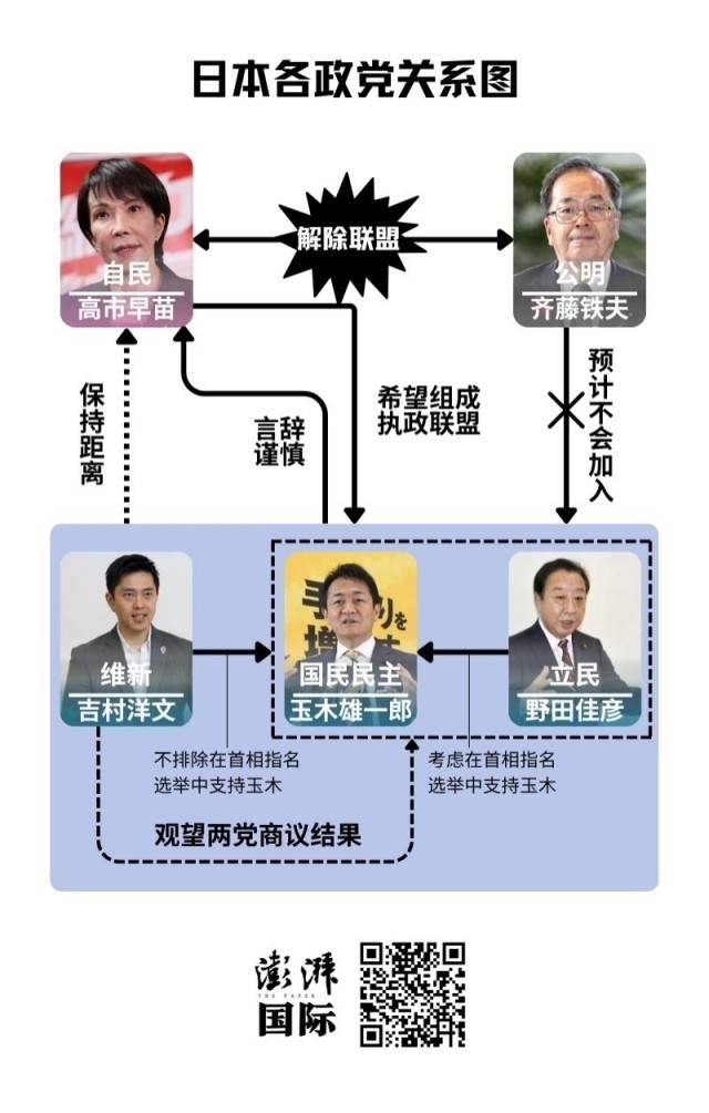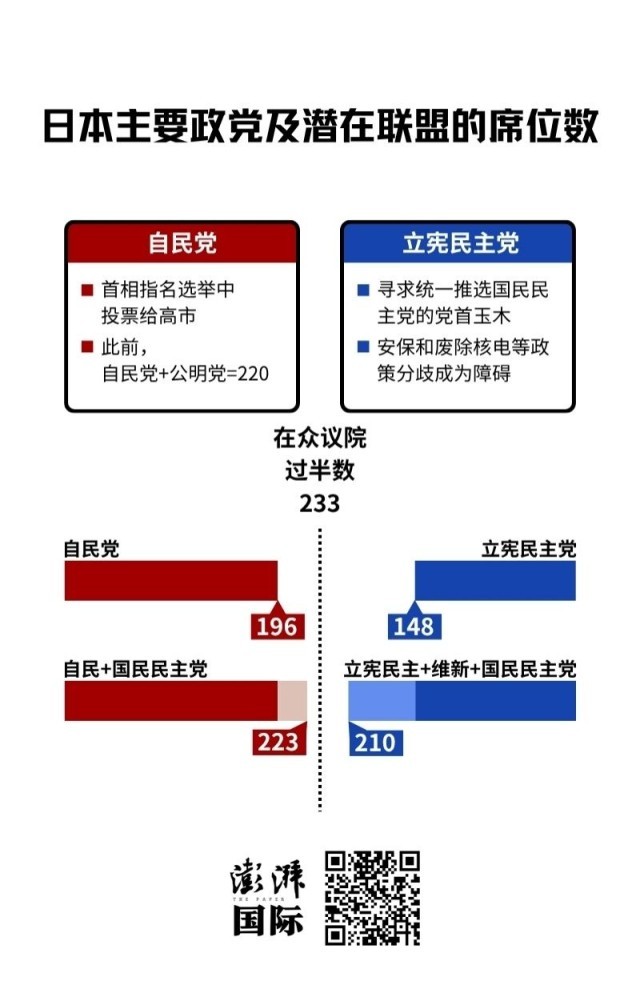 同时,自民党也依然在争取与国民民主党合作。国民民主党干事长榛叶贺津14日表示,作为联合执政条件提出三项重点——修宪、能源政策和安全保障。自民党干事长铃木表示:“我们的基本理念并无差异,希望能携手合作。”榛叶也回应称“基本理念几乎一致”。这与此前玉木的表态形成温差。
