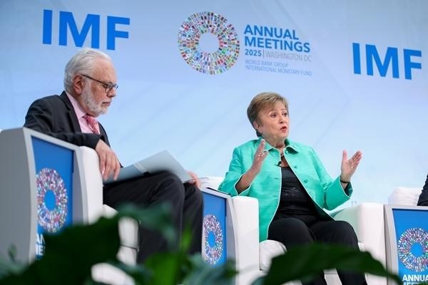 10月15日,美国华盛顿,国际货币基金组织(IMF)总裁格奥尔基耶娃(右)在国际货币基金组织与世界银行秋季会议上发表讲话。IMF警告称,尽管全球经济迄今表现好于预期,美国全面关税和贸易保护主义已使其面临压力。视觉中国供图