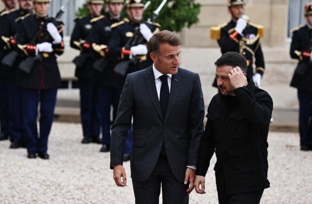 9月3日,在法国巴黎总统府爱丽舍宫,法国总统马克龙(左)迎接来访的乌克兰总统泽连斯基。新华社记者高静摄