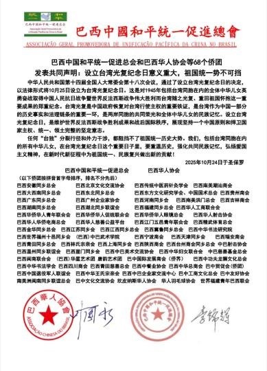 中新网圣保罗10月25日电 巴西中国和平统一促进总会和巴西华人协会等68个侨团24日在巴西圣保罗发表共同声明:设立台湾光复纪念日意义重大,祖国统一势不可挡。
