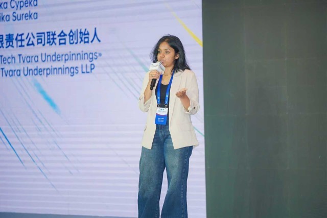 11月6日,山东青岛,来自印度的上合组织国家青年代表在2025上合组织青年发展论坛上进行闪电发言。主办方供图