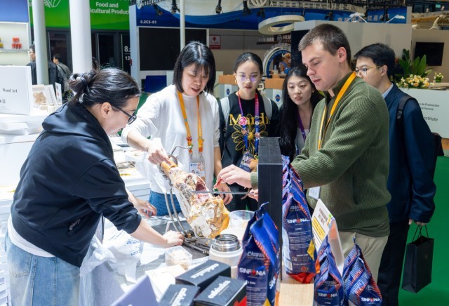 2025年11月5日,在第八届进博会农食产品展区,参展商为观众介绍伊比利亚火腿。(图片来源:新华社)