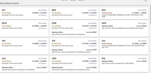 △航班追踪网站截图,美国部分出现延误情况的机场