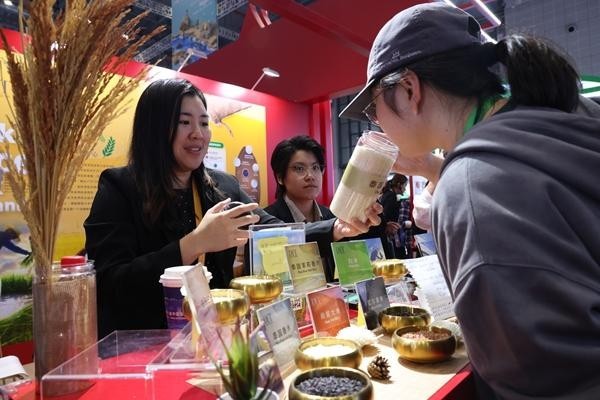 11月9日,上海,泰国以主宾国身份参与第八届进博会,精心打造640平方米泰国农食产品企业馆。图为泰国参展商推介泰国香米。中国已成为泰国最大的农产品出口市场。视觉中国供国