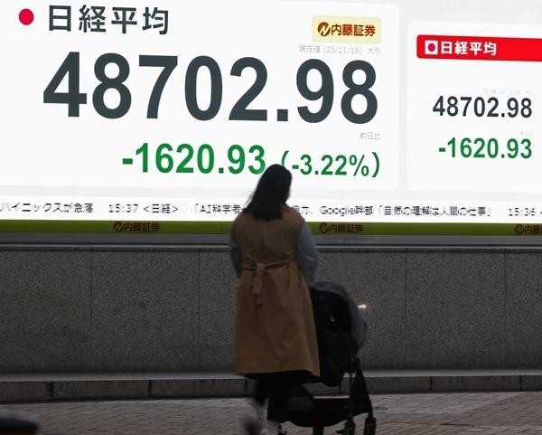 11月18日,日本东京,一块金融数据板显示,日经225指数收盘跌破49000点,较前一交易日下跌逾1600点。受多重因素影响,17日,日经225指数盘中一度跌超1%,百货公司、运输、消费等旅游相关股票遭投资者抛售。视觉中国供图