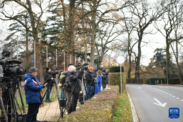 11月23日,记者在瑞士日内瓦美国常驻联合国日内瓦办事处代表团驻地外等候。新华社记者 连漪 摄