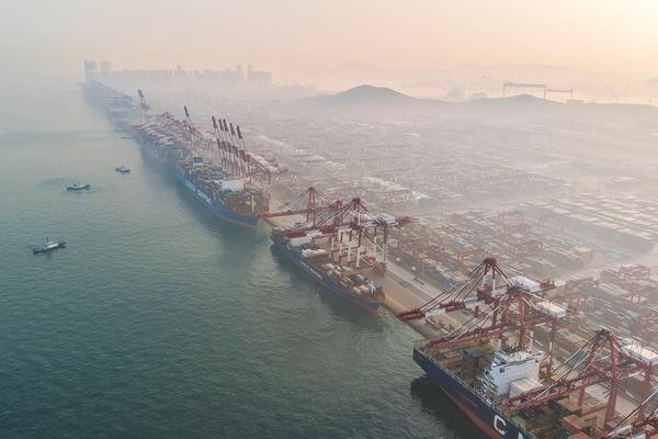 11月24日,青岛港晨雾缭绕,装卸运输工作井然有序。视觉中国供图