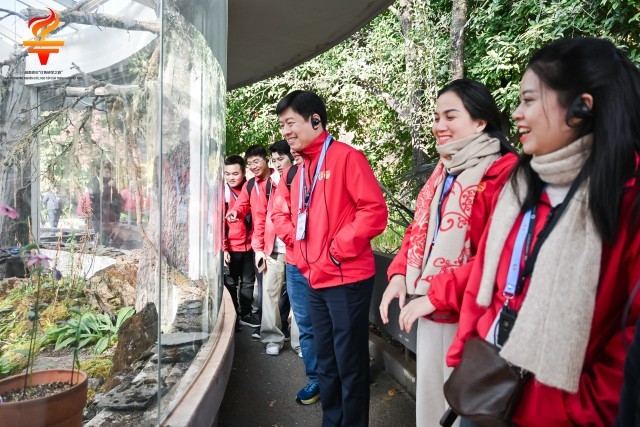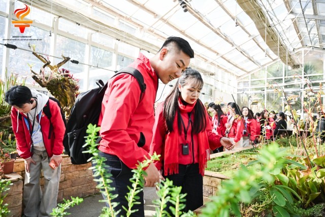 12月2日,云南昆明植物园,越南青年在“扶荔宫”温室群高山植物馆前聆听讲解员介绍高山植物生长特性。主办方供图