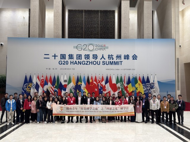 12月4日,浙江杭州,越南青年走进杭州国际博览中心,该中心是2016年二十国集团(G20)领导人第十一次峰会主会场。2016年,中国作为主席国第一次举办G20峰会。杭州峰会首次把发展问题置于全球宏观政策框架的突出位置,首次就落实联合国2030年可持续发展议程制定行动计划,首次就支持非洲国家和最不发达国家工业化开展合作,首次将“绿色金融”纳入峰会议题,具有开创性意义。中青报·中青网记者 马子倩/摄