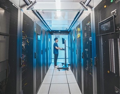 广东横琴粤澳深度合作区内,科研人员在国家新一代类脑人工智能公共算力开放创新平台数据中心机房内调试设备。