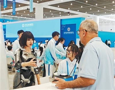 在上海合作组织天津峰会新闻中心,外国媒体记者与多模态交互型机器人“小合”对话。