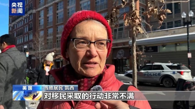 当地居民 凯西:我今天来这里是因为我对特朗普政府的执法人员,对移民采取的行动非常不满。移民及海关执法局给平民带来恐怖的杀戮,我要来参加集会表达我的观点态度。移民及海关执法局的暴力执法,让我非常伤心。我们平民还能怎么办呢?必须要走上街头抗议。