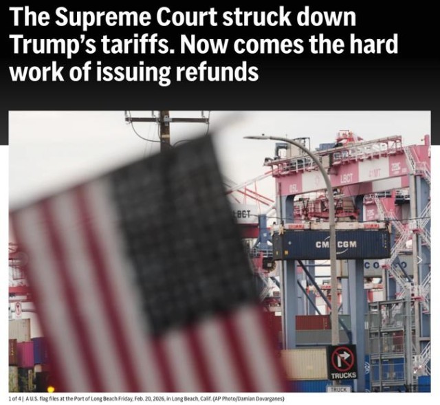 △美联社报道,最高法院驳回特朗普的关税政策后,艰巨的退还税款任务开始了