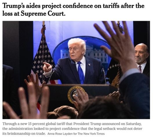 △《纽约时报》报道,特朗普政府当地时间22日表示,新的征税方法将以更合法、更持久的方式实现美国的贸易目标