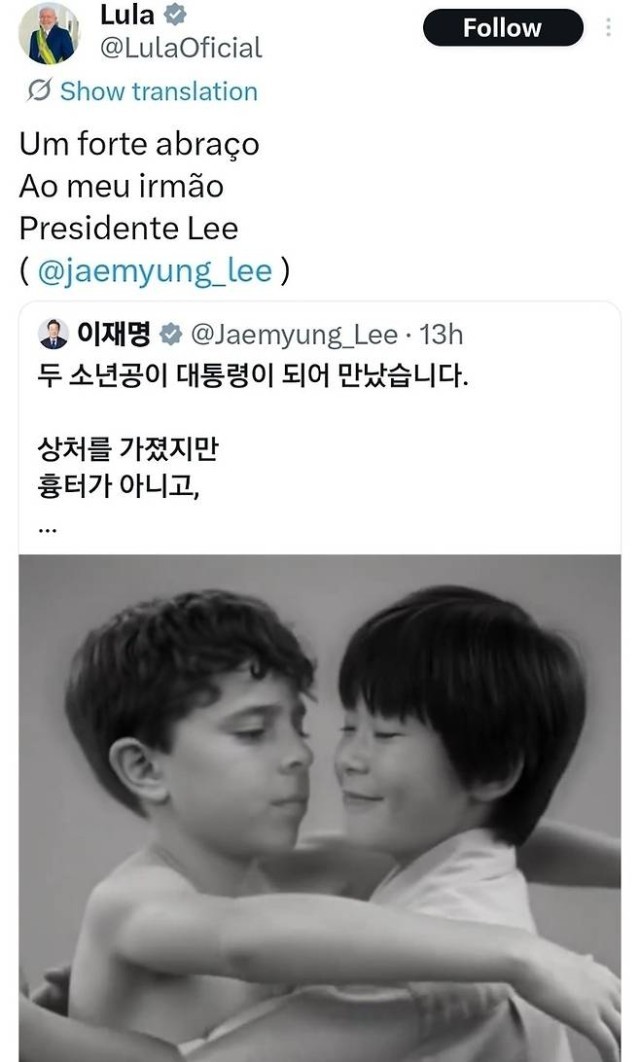 【环球时报驻韩国特约记者 刘媛 环球时报特约记者 王逸】据韩联社报道,巴西总统卢拉24日结束了他在韩国的访问。当天,他在社交媒体平台X上转发了一条配有AI视频的帖子,并留言:“给我的兄弟李在明总统一个深深的拥抱。”该帖子由韩国总统李在明23日上传至X平台,AI视频以他和卢拉童年时期的照片为素材。画面从两人小时候相互拥抱,过渡到现在以总统身份再次相拥。这种互动加深了韩巴领导人之间的友谊。(如图)