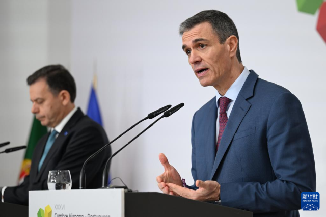 3月6日,在西班牙韦尔瓦省拉拉比达,西班牙首相佩德罗·桑切斯(右)在西班牙-葡萄牙峰会新闻发布会上讲话。新华社发(西班牙首相府供图)