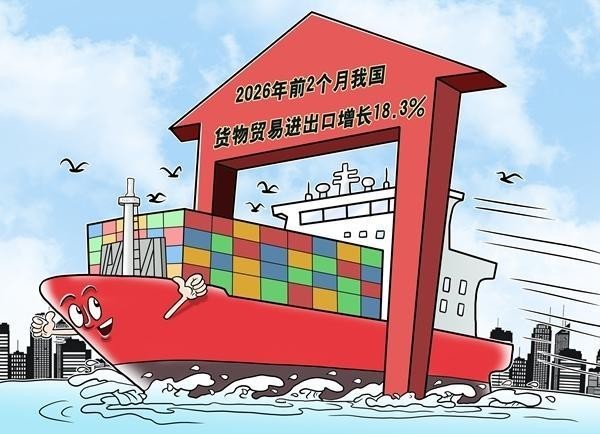 3月10日,中国海关总署网站发布消息,据海关统计,2026年前两个月,中国货物贸易进出口总值7.73万亿元,同比增长18.3%。视觉中国供图