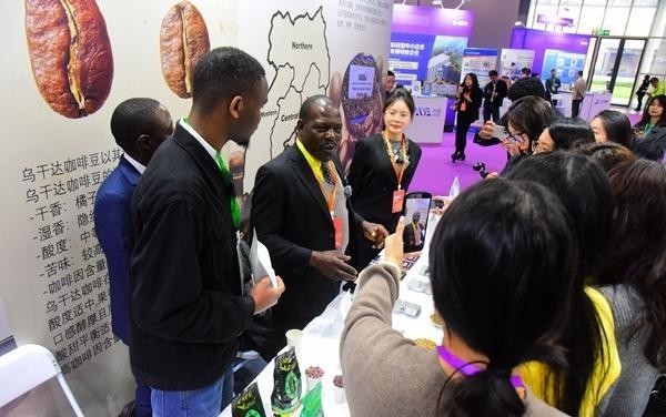 3月15日,杭州,“共享大市场·出口中国”之“浙里买全球·消费启航”活动举行,汇聚了俄罗斯、巴西、南非等15个金砖国家的优质商品。图为展商介绍乌干达咖啡豆。视觉中国供图