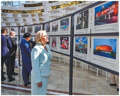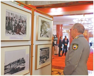 当地时间2025年8月15日,在白俄罗斯首都明斯克,观众参观纪念中国人民抗日战争暨世界反法西斯战争胜利80周年图片展。
