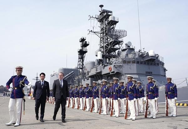 3月22日,日本横须贺,日本防卫大臣小泉进次郎(中)陪同来访的德国国防部长皮斯托里乌斯(右)参观海上自卫队舰艇。视觉中国供图