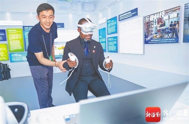 3月24日,高标准建设海南自由贸易港主题展在博鳌东屿岛文化公园开展,外籍嘉宾体验认知障碍VR治疗产品。海南日报全媒体记者李天平 摄