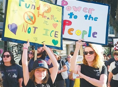 不久前,人们在美国加利福尼亚州洛杉矶市政厅前手举标语参加示威活动,抗议美国联邦当局对移民暴力执法。